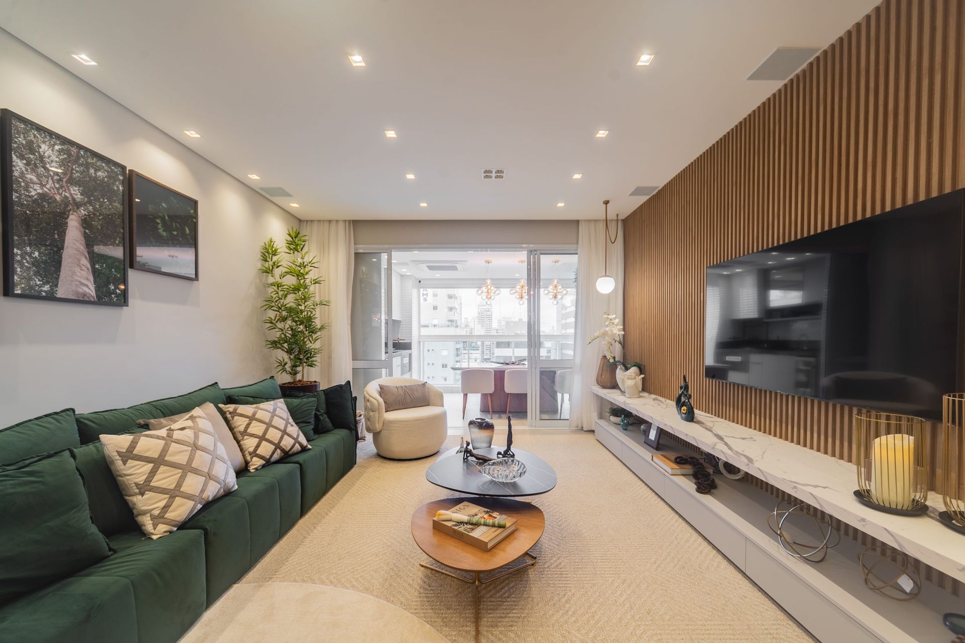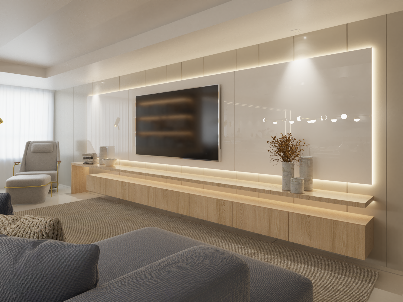 ... reflete sofisticação e exclusividade em cada detalhe. Com um design clean e paleta de tons neutros, o ambiente transmite serenidade e elegância atemporal. Mobiliário de linhas suaves, materiais nobres e iluminação suave criam uma atmosfera acolhedora, perfeita para momentos de relaxamento ou recepções elegantes. O equilíbrio entre estética e conforto transforma o espaço em um verdadeiro refúgio de bom gosto.